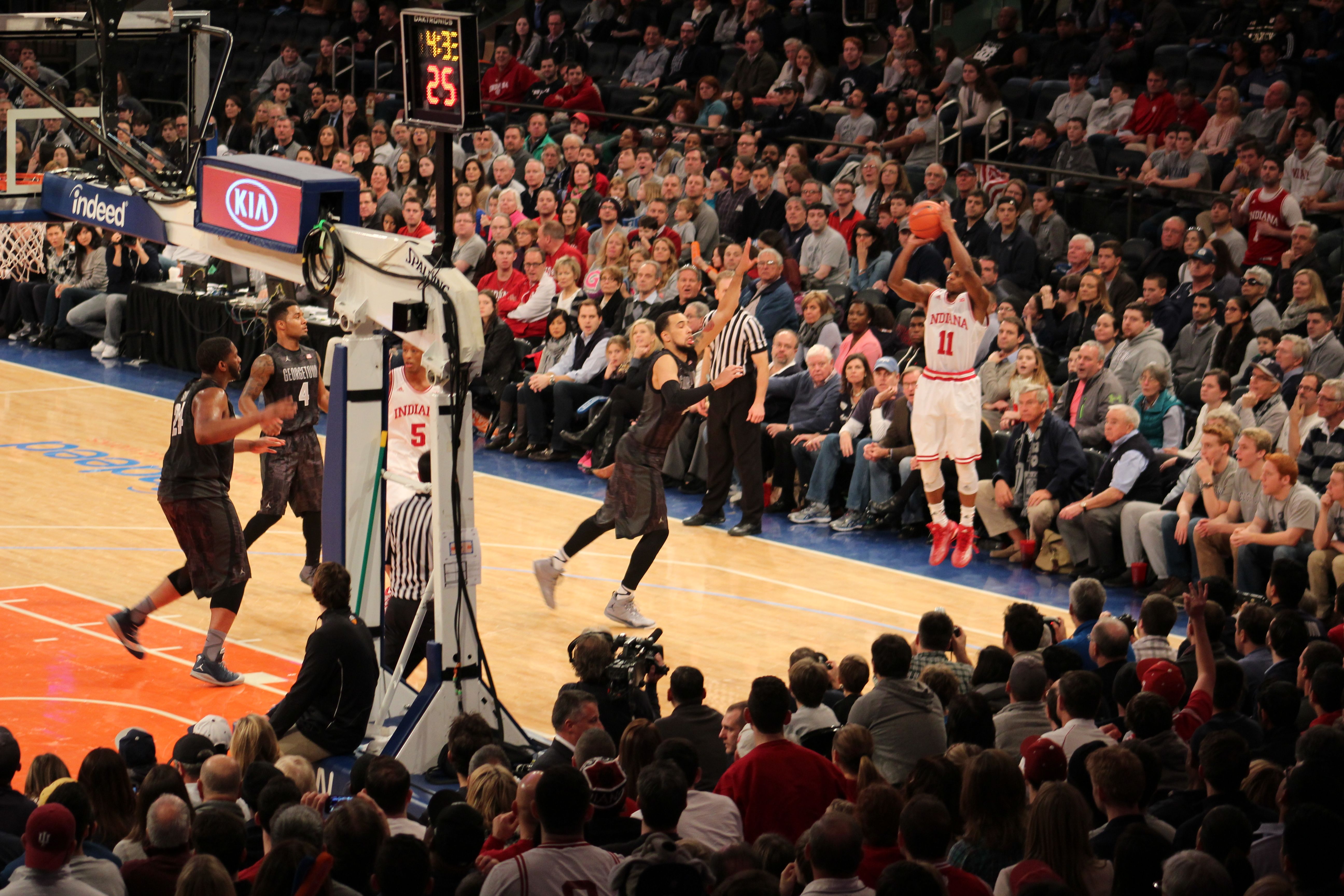 This was a magical holiday showcase at the World’s Most Famous Arena. I will forever remember how I watched a future NBA lottery pick in Troy Williams. This kid looked like Tracey McGrady around the rim and played point guard late in the game when good possessions mattered most. This photo (above) was taken right after his running floater tied the game up late. Ferrell, Williams, and Blackmon Jr. (pictured left, center, right respectively) would be a top 10 college basketball team next year if they would all return to school. However, the lack of production and defense in the middle makes me hesitant to think they’ll make a Sweet 16 run. I hate to say it, but I feel the same about the Georgetown Hoyas. I think that this team is not Sweet 16-worthy. Any team with a valid post scorer can find a way to get Josh Smith into foul trouble. Without his 14 points, and magnetic size down low, this is a different game.
