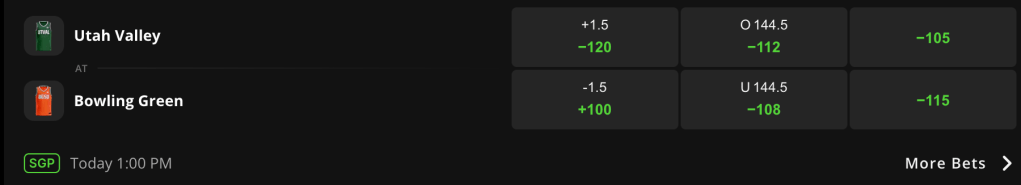 I don’t see a let down from Bowling Green here in this spot as they are spotting Utah Valley a casual 1 1/2 points, according to DraftKings line as of one hour before tip nationwide.